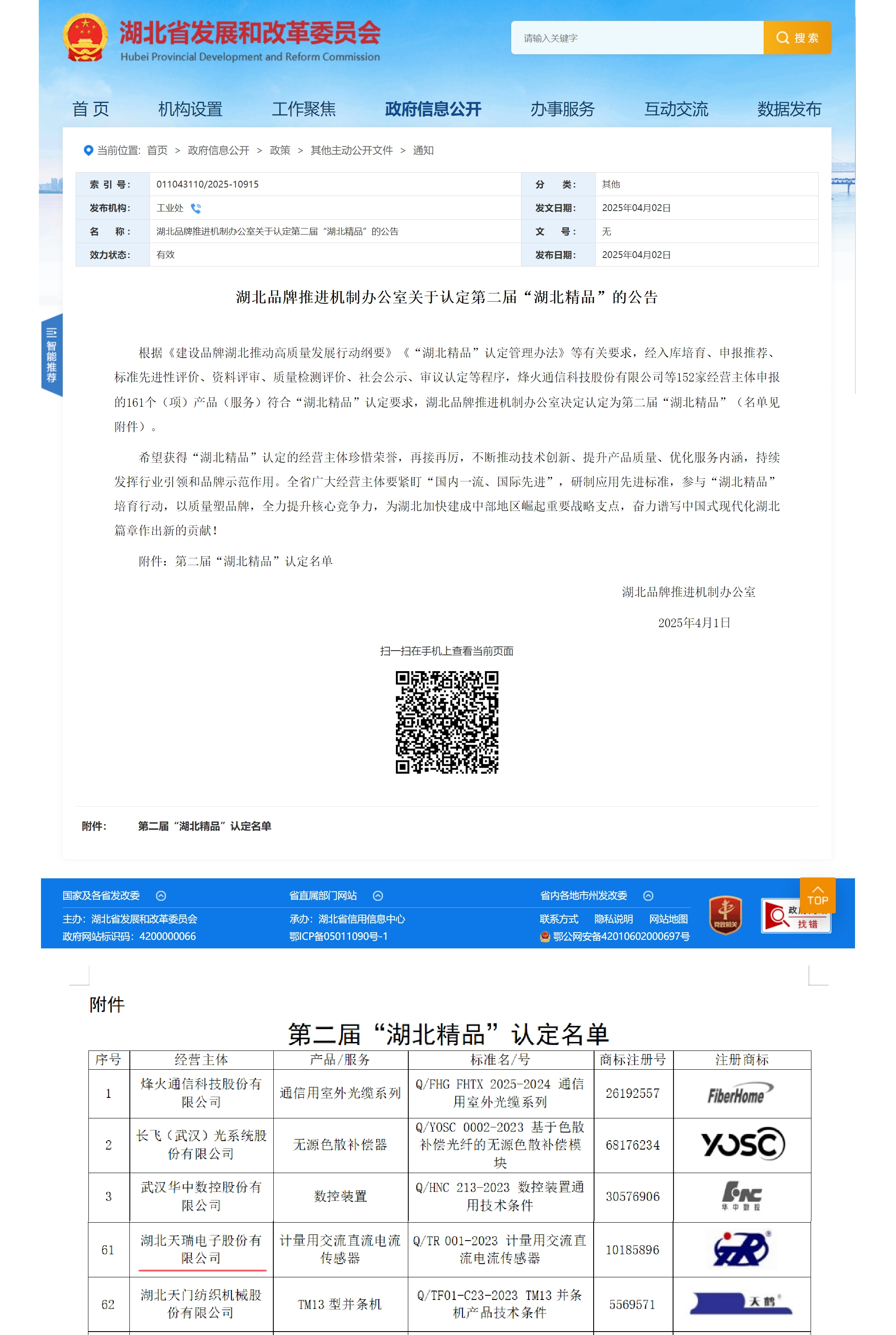 2025年4月2日,天门讯——近日,湖北省发展和改革委员会官网发布《湖北品牌推进机制办公室关于认定第二届“湖北精品”的公告》,星空体育在线登录入口(China)官方网站(以下简称“天瑞电子(837601.NQ)”)自主研发的“计量用交流直流电流传感器”凭借其卓越的技术创新性、产品可靠性和市场竞争力,成功入选第二届“湖北精品”名单。这是继公司多项产品获国家级、省级荣誉后,在品牌建设和质量提升领域取得的又一重要突破。